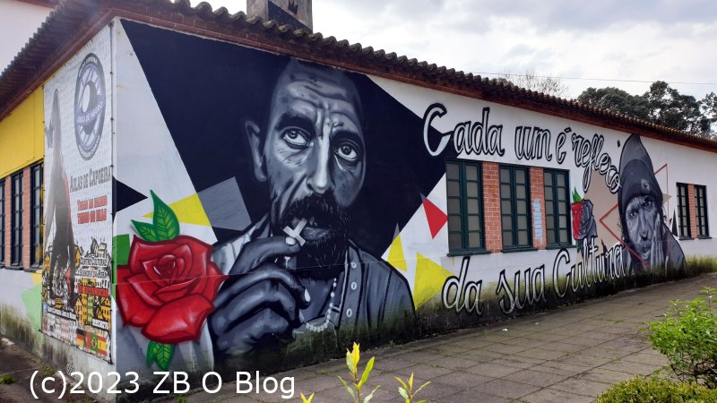 Foi na Senhora da Hora, Matosinhos, Portugal, que fotografei esta linda imagem. Os personagens pintados na parede só podiam ser Brasileiros. Jagunços oriundos daquelas terras amazónicas quase sem fim, onde o mar é para muitos longe p’ra caraças e a terra nunca mais acaba. Assim como a esperança de serem alguém minimamente importante está longe p’ra caraças e a pobreza nunca mais acaba. Mas em Portugal têm encontrado aquele pequeno espaço acolhedor para lançarem os seus exóticos negócios, como por exemplo a Capoeira, uma arte de combate (não sei se de ataque ou de defesa) toda brazuka que eu já presenciei e a que achei muita piada. Aqui, Brasileiro está encontrando aquele território de gente que dizem amar e adorar e curtir porque é sempre bom dizer bem de quem nos acolhe. Aqui, os Brasileiros já são mais que as mães mas está bem. Na proporção em que nos auto-extinguimos eles vão ocupando o espaço que vai ficando livre.